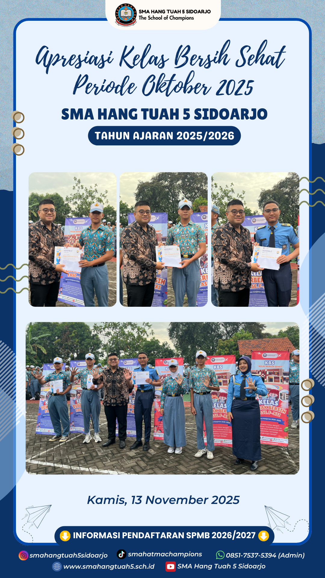 SMA Hang Tuah berkomitmen disiplin tidak hanya soal ketertiban dan tepat waktu, kerapian dan kebersihan merupakan tanggung jawab semua warga sekolah. Apalagi kebersihan dan kerapian kelas adalah kewajiban yang harus terus dilaksanakan sleuruh Taruna tingkat awal sampai akhir dengan bertanggung jawab. Selamat kepada kelas yang terpilih untuk menjadi teldan kebersihan pada bulan Oktober 2025.