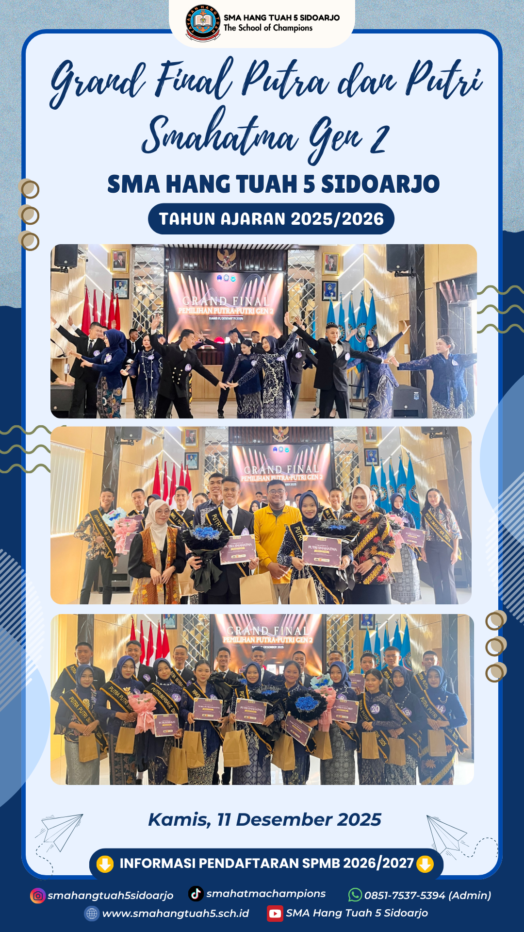 Perjalanan panjang penuh dedikasi dan perjuangan dalam menunjukkan bakat yang luar biasa untuk menjadi Putra Putri SMAHATMA Generasi ke-2. Selamat kami ucapkan kepada para pemenang Putra dan Putri, sekarang saatnya tunjukkan sinarmu untuk kemajuan SMA Hang Tuah 5 Sidoarjo.